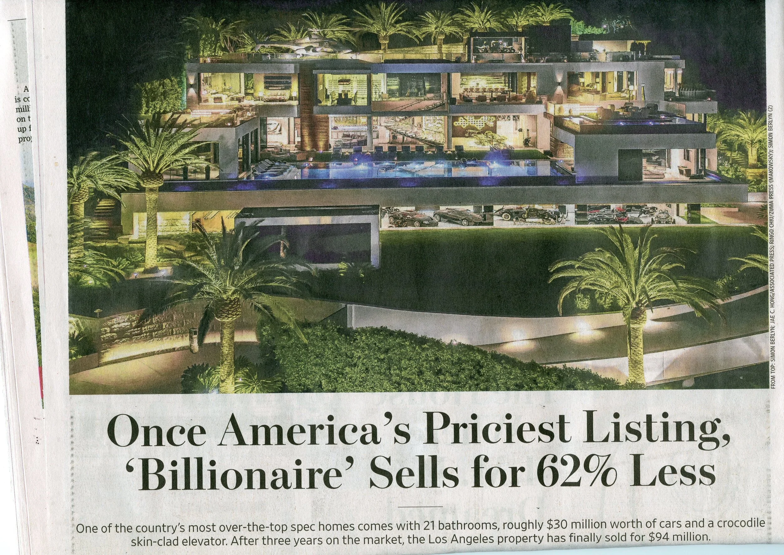 If this house looks vaguely familiar, you might remember it as the subject of my essay on September 9, 2018, Perfection’s Detractor. It’s America’s most expensive home. Twenty one bathrooms, a helipad, three kitchens, a crocodile skin elevator, a bowling alley, a candy room and umpteen other amenities, attempted to justify the listing price of $250 million. The market for America’s most expensive home was soft- three years later and goosed by a $150 million price reduction -finally, a sale.
