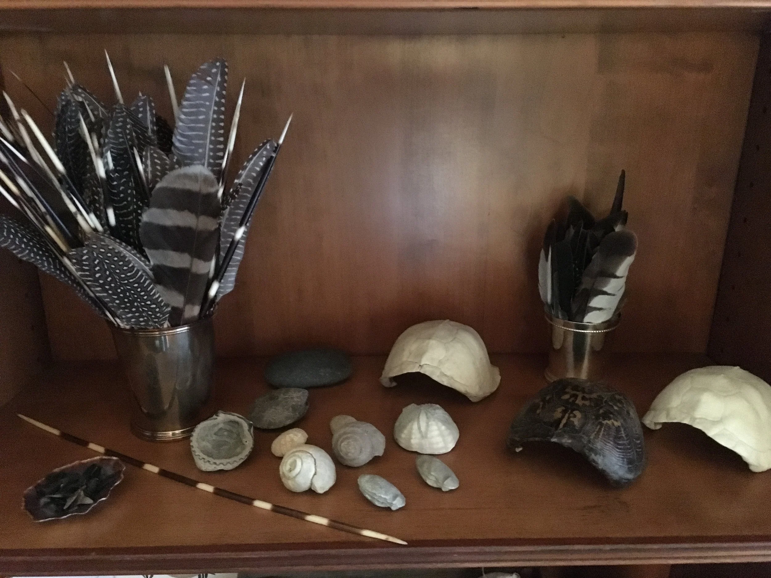 About the picture- it’s mine, not the WSJ writer’s. And mine’s not clutter either. There are feathers from all over the place. And porcupine quills from the Masai Mara in Kenya. And sharks’ teeth from Figure Eight. And turtle shells from our farm. And a smooth stone from Cape Cod. And fossilized shells from the Sinai Desert. In short, I know the provenance of each of these finds. I don’t hold my found treasures as a model of artistic design, but truth be told, if the individual parts are good, you don’t have to be very clever to make a good design. As the style maven, Gloria Vanderbilt said, “Decorating is autobiography.”